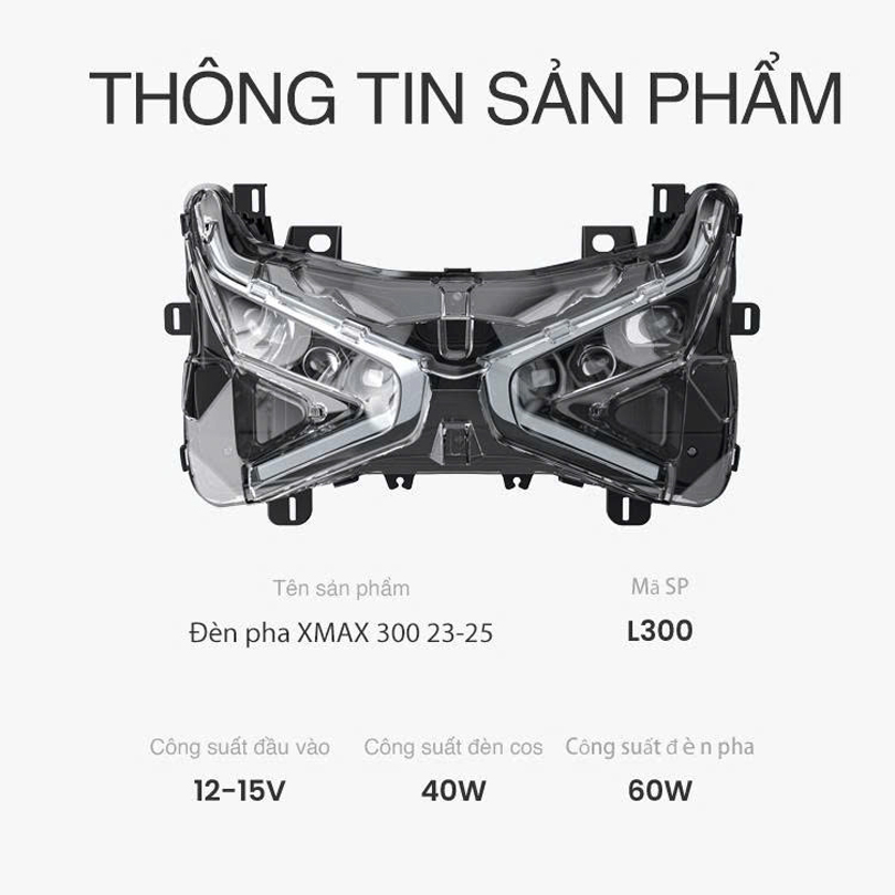 Bộ choá đèn bi cầu được hãng Loboo thiết kế dành riêng cho xe Xmax 300, với những tính năng thông minh vượt trội cũng như độ chiếu sáng tăng lên 400% so với đèn zin. Chức năng thông minh Hỗ trợ chiếu sáng khi vào cua (Intelligent Cornering Assist Lighting): Một tính năng đột phá tự động chiếu sáng phía bên trong khúc cua khi xe nghiêng, cải thiện đáng kể tầm nhìn và sự an toàn khi ôm cua, nhất là trên các đoạn đường tối. Ngoài ra có đèn định vị Daylight thiết kế đẹp mắt liền lạc hơn đèn zin theo xe. Đặc biệt lắp đặt dễ dàng và lắp zin 100% không chế độ hay cắt nhựa.